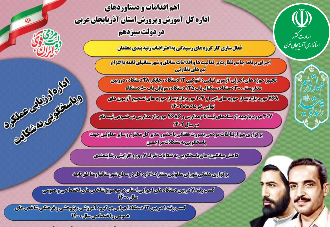 به گزارش روابط عمومی استانداری آذربایجان غربی، بخشی از وعده های دولت سیزدهم به مردم که با اهتمام دستگاه های اجرایی در سطح استان آذربایجان غربی به سرانجام رسیده است.