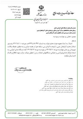 بر اساس ابلاغیه معاونت توسعه مدیریت و منابع استانداری آذربایجانغربی، دستگاههای اجرایی استان در روزهای چهارشنبه و پنجشنبه تعطیل است.