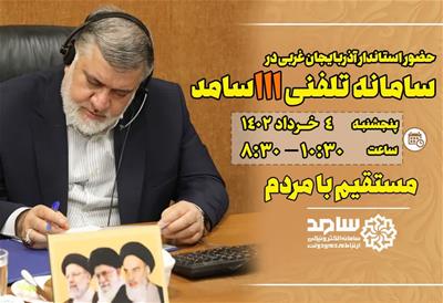 استاندار آذربایجان غربی روز پنجشنبه 4 خرداد 1402 راس ساعت 8:30 الی 10:30 با حضور در سامانه ارتباط مردم و دولت (سامد) و از طریق تلفن 111 بهصورت مستقیم پاسخگوی تماسهای مردم عزیز خواهد بود.