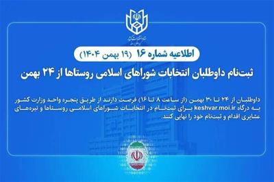 ستاد انتخابات کشور در اطلاعیه شماره 16 اعلام کرد: ثبتنام داوطلبان انتخابات شوراهای اسلامی شوراهای اسلامی روستاها و تیرههای عشایری سراسر کشور از 24 تا 30 بهمن انجام میشود. داوطلبان برای ثبتنام باید از طریق پنجره واحد وزارت کشور به درگاه keshvar.moi.ir اقدام کنند.