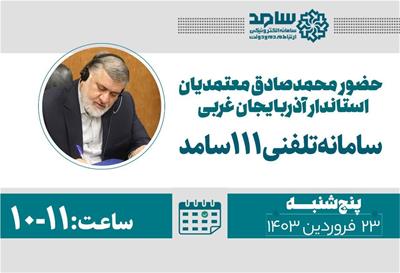 استاندار آذربایجانغربی روز پنجشنبه 23 فروردین ماه 1403 از ساعت 10 الی 11 صبح در سامانه تلفنی 111 سامد حضور می یابد.