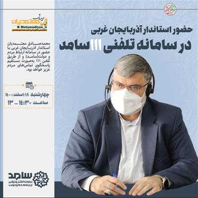 محمدصادق معتمدیان استاندار آذربایجان غربی روز چهارشنبه 18 اسفند ماه 1400 از ساعت 13 الی 14:30 با حضور در سامانه ارتباط مردم و دولت (سامد) و از طریق تلفن 111 بهصورت مستقیم پاسخگوی تماسهای مردم عزیز استان خواهد بود.