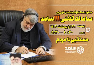 استاندار آذربایجان غربی روز پنجشنبه 21 اردیبهشت 1402 با حضور در سامانه ارتباط مردم و دولت (سامد) و از طریق تلفن 111 بهصورت مستقیم پاسخگوی تماسهای مردم عزیز خواهد بود.