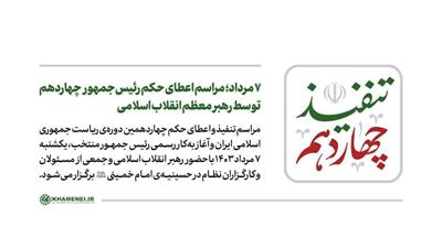 مراسم تنفیذ و اعطای حکم چهاردهمین دورهی ریاست جمهوری اسلامی ایران و آغاز بهکار رسمی رئیسجمهور منتخب، یکشنبه 7 مرداد 1403 با حضور رهبر انقلاب اسلامی و جمعی از مسئولان و کارگزاران نظام در حسینیه امام خمینی(ره) برگزار میشود.