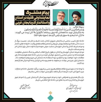 پیام مشترک نماینده ولی فقیه در استان و امام جمعه ارومیه و استاندار آذربایجان غربی به مناسبت حادثه تلخ تخریب بخشی از ساختمان متروپل آبادان و از دست دادن تعدادی از هم میهنان عزیزمان در این حادثه