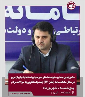 معاون هماهنگی امور عمرانی استاندار آذربایجان غربی در سامانه سامد برای پاسخگوی سؤالات مردم خواهد بود.
