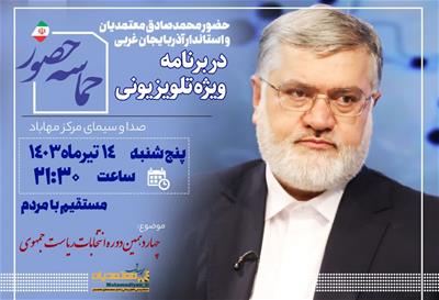 محمدصادق معتمدیان استاندار آذربایجانغربی امشب در برنامه ویژه تلویزیونی "حماسه حضور" صداوسیمای مرکز مهاباد با موضوع چهاردهمین دوره انتخابات ریاست جمهوری حضور یافت.