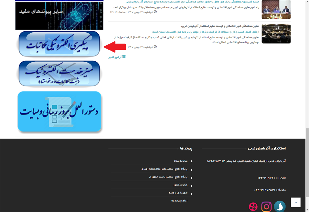 گام هفتم: جهت اطلاع از وضعیت درخواست خود میتوانید به سایت استانداری آذربایجان غربی به آدرس http://www.ostan-ag.gov.ir مراجعه فرمایید و از قسمت" پیگیری الکترونیکی مکاتبات" نسبت به پیگیری درخواست خود اقدام نمایید.